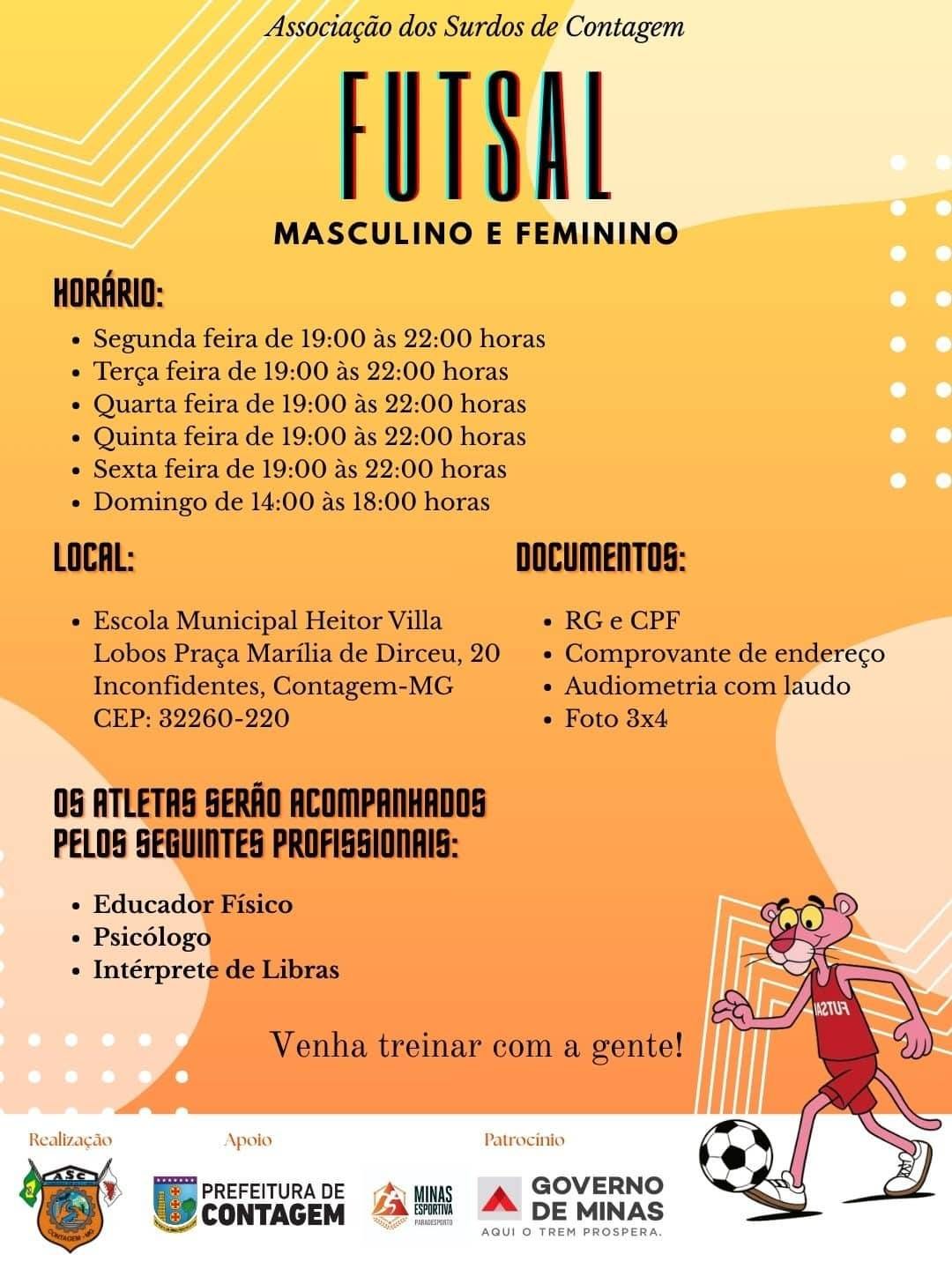 A Associação dos Surdos de Contagem realizará o projeto Futsal para Surdos em parceria com a Sedese e com o apoio da Secretaria de Direitos Humanos e Cidadania de Contagem e da Prefeitura de Contagem. O projeto terá duração de 1 ano com início em fevereiro de 2026. Poderão se inscrever pessoas com deficiência auditiva masculino ou feminino. Os treinos acontecerão na